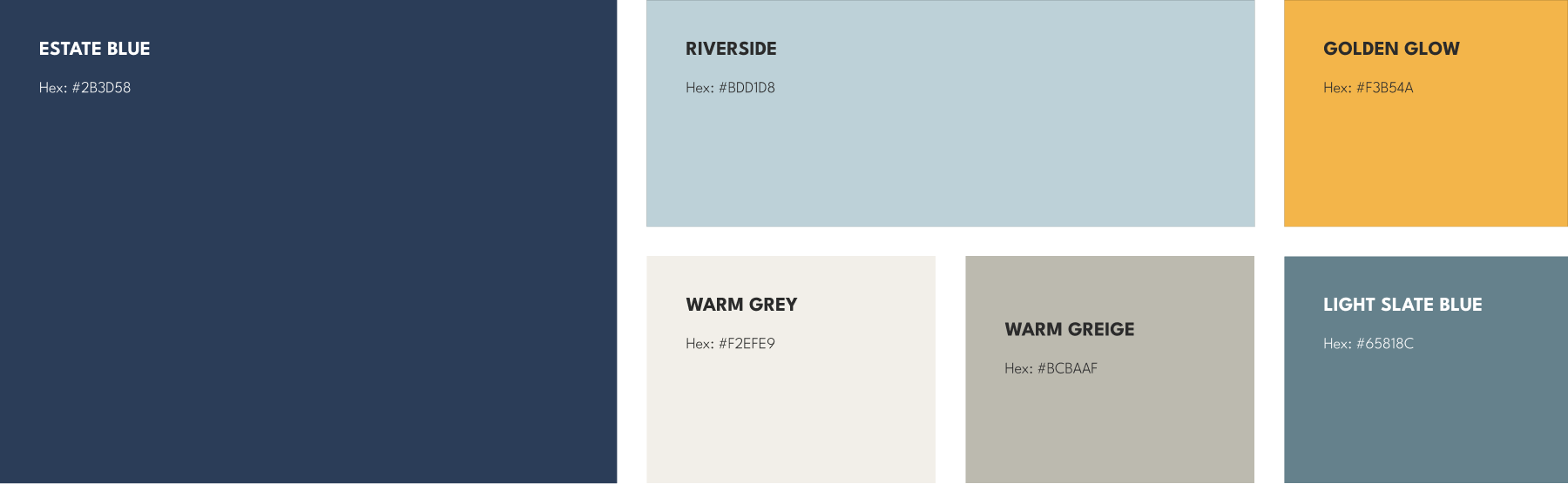 The refreshed palette draws from muted tones found in Parisian architecture and traditional wine environments: deep Estate Blues, soft Slate Blues, warm neutrals and a subtle golden accent. These colours create a calm, sophisticated atmosphere while offering strong contrast when paired with the logomark.